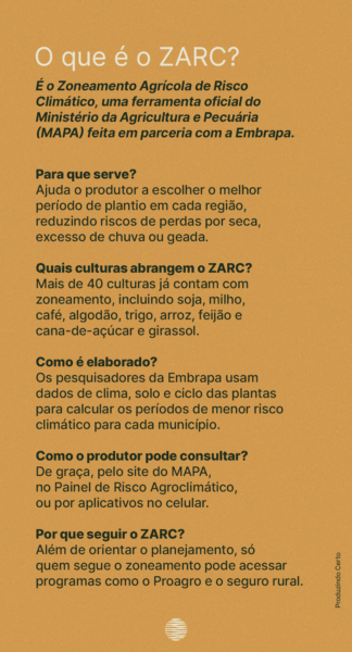 Para dar respostas com embasamento técnico e científico a essas questões, foi criado o Zoneamento Agrícola de Risco Climático (ZARC), um instrumento de política agrícola e gestão de riscos na agricultura do governo brasileiro desenvolvido em parceria com a Embrapa.